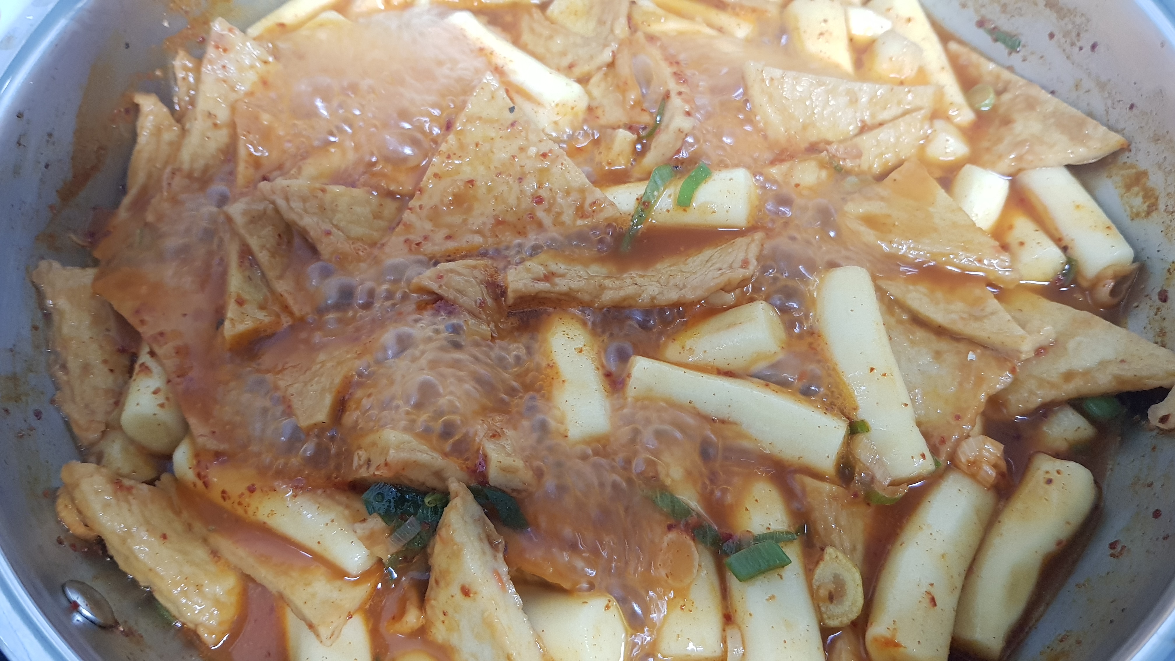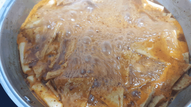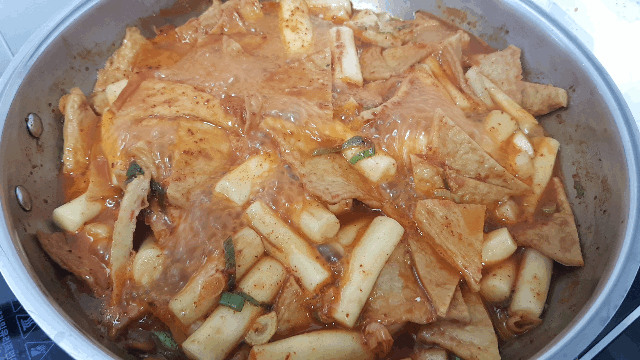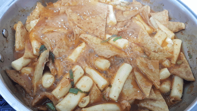 불을 끄고 5분정도 지나면 통통하게 불었던 밀떡이 조금 줄어듭니다. 이 때 국자로 퍼서 드시면 좋아요~