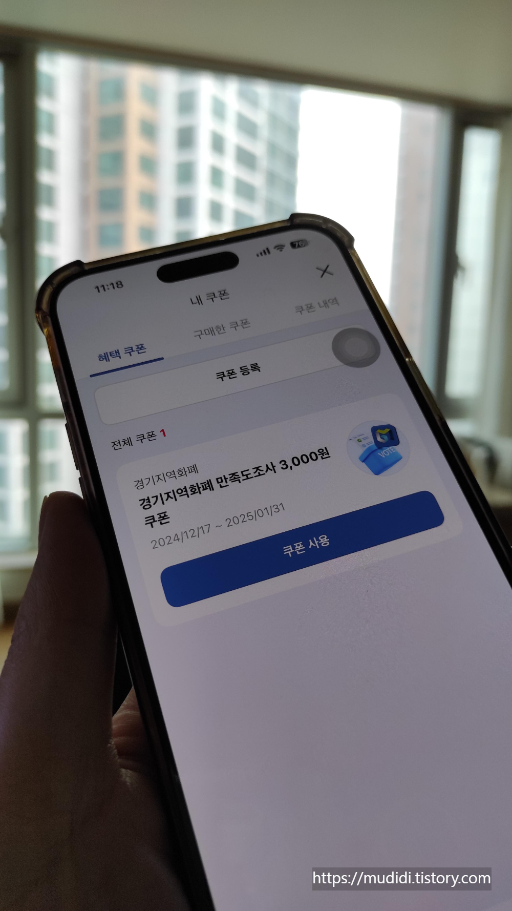 - 쿠폰이 지급된 것을 확인하고, "쿠폰 사용" 버튼을 눌러주세요.