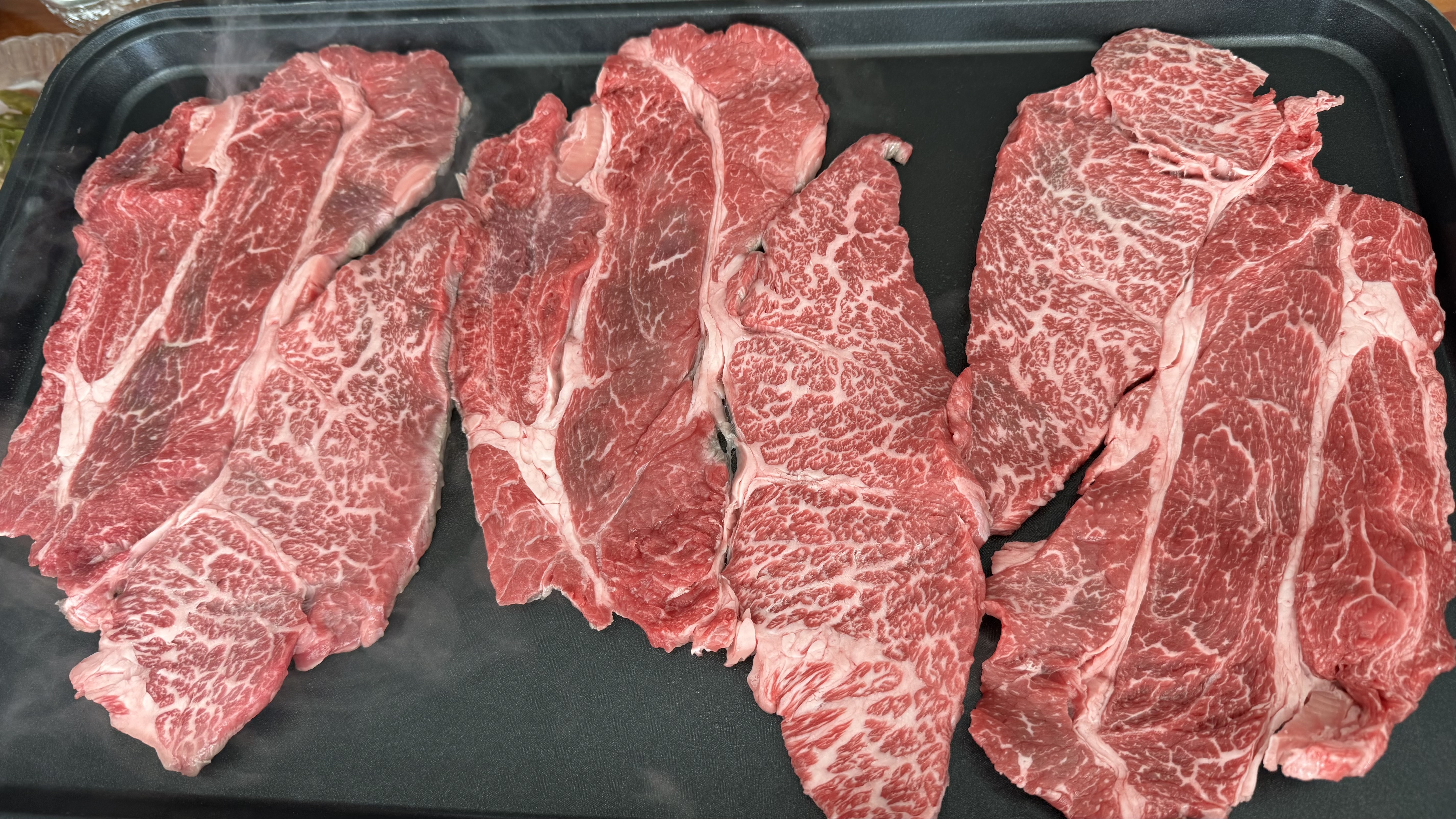 집에 와서 포장을 뜯자 고기 결이 눈에 들어왔다. 붉은빛이 선명하고, 마블링이 곱게 퍼져 있었다. 사진으로는 다 담기지 않았지만, 실제로 보면 윤기가 살아 있다. 점심 준비라 대단할 건 없었는데, 불판 올리는 순간부터 분위기가 확 달라졌다.