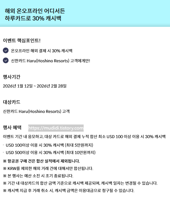 도쿄 여행 일정을 정리하던 중, 이번 주에 신한카드 Haru의 새로운 이벤트가 시작된 걸 봤다. 1월 12일부터 해외 온·오프라인 결제 시 30% 캐시백을 제공하는 행사였는데, 막 개시된 따끈한 이벤트라 자세히 들여다보게 됐다. 작년에도 이런 프로모션이 있었지만, 이번에는 조건이 조금 더 단순하고 중복 혜택이 많았다. 일본 여행 준비 중이라서 자연스럽게 계산기를 꺼내보게 됐다.