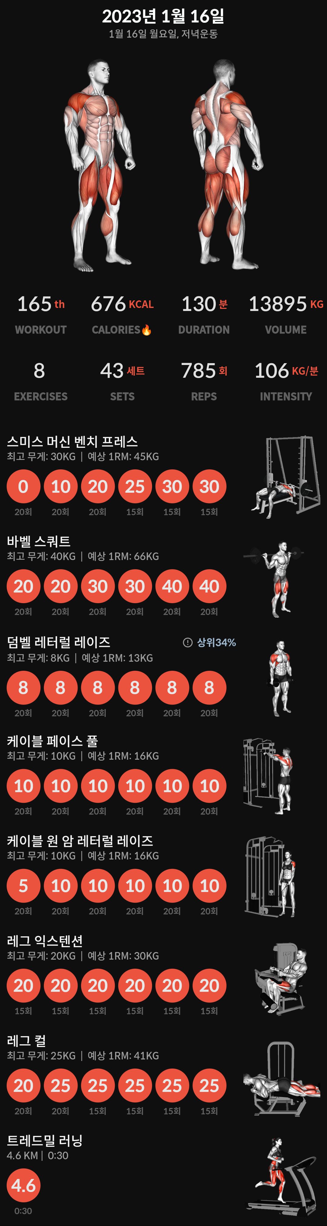 매일 빠지지 않고 운동해야 하는데, 앞으론 쉬는 날보다는 쉬려고 하는 날에는 간단하게라도 러닝머신만 하도록 하는게 좋을 것 같다.
