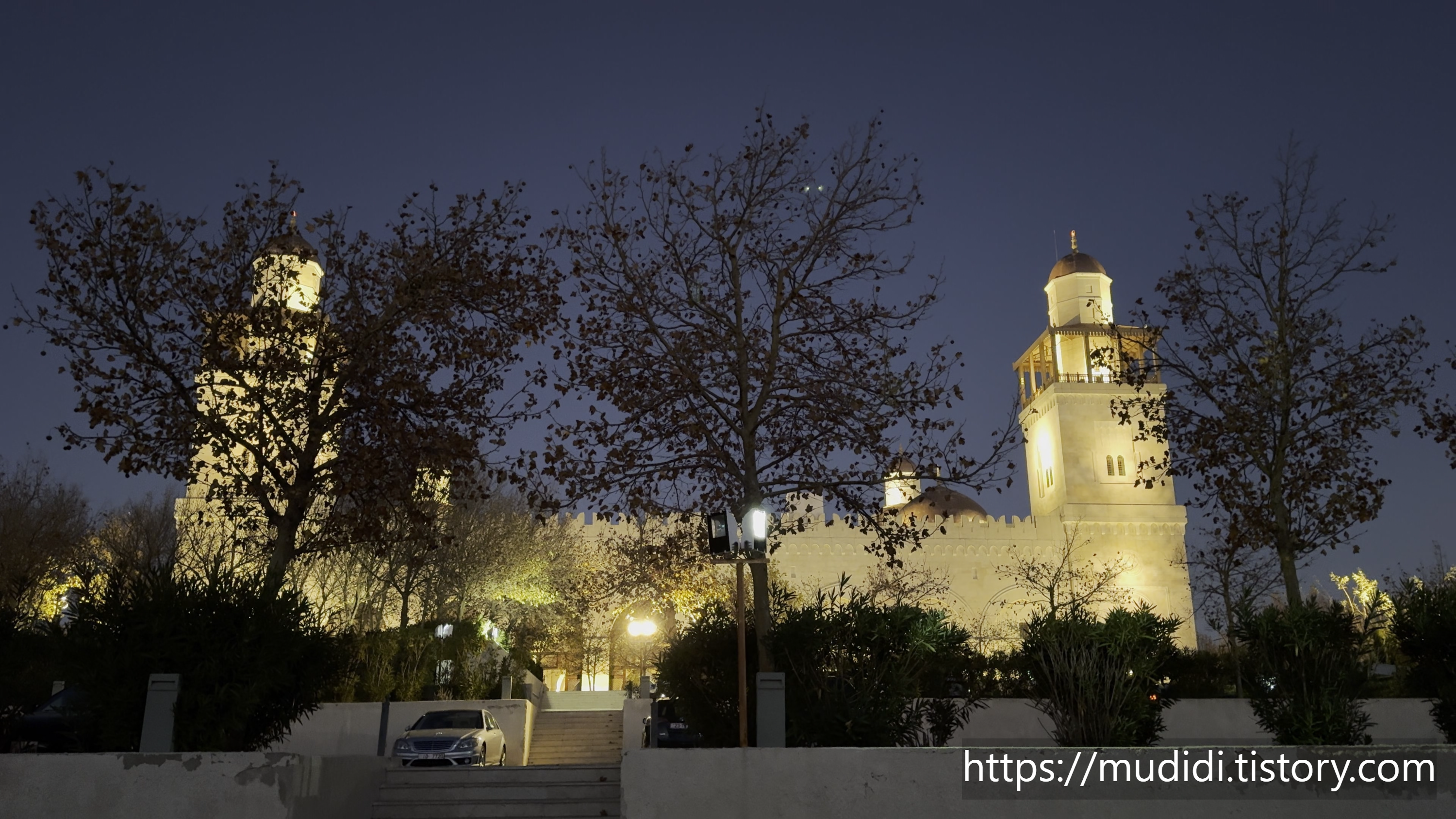 주차장을 통해서 나가는 길에 킹 후세인 사원을 보니까 야경이 너무너무 멋있어서 영상을 찍었는데, 영상에는 그 멋있음이 다 안담겨서 아쉬웠다.