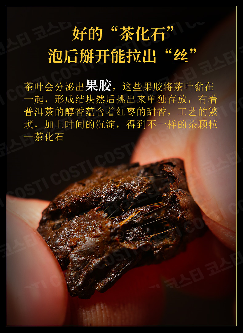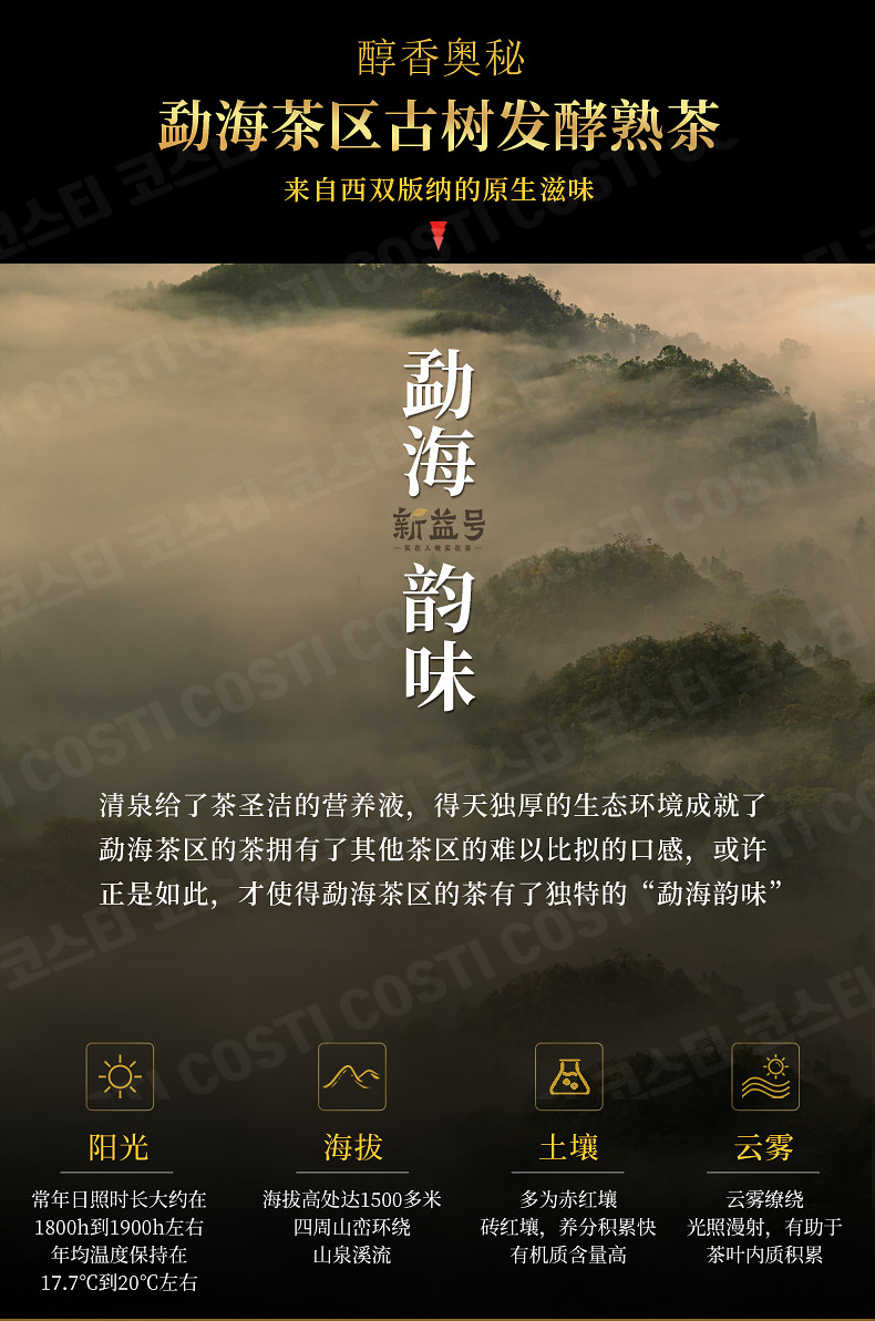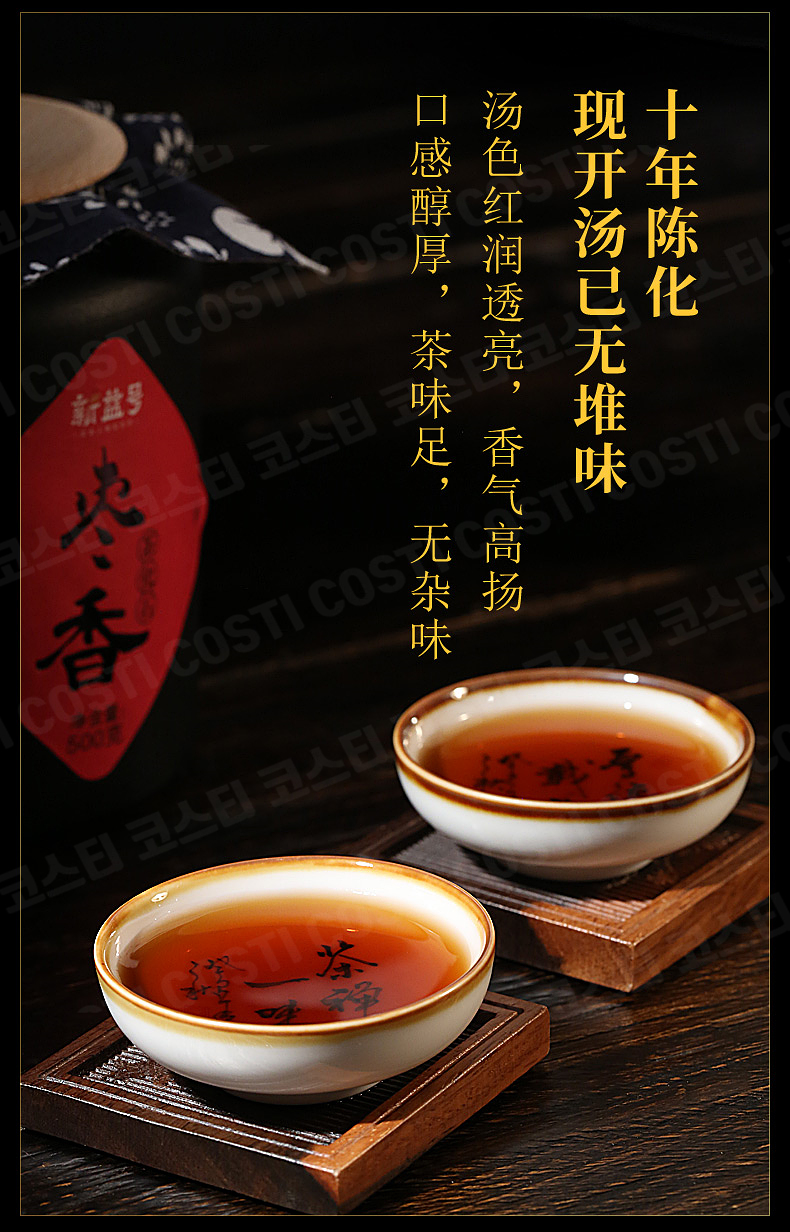 중국 운남성 맹해의 고수(古树)에서 봄(春)에 채취한 잎으로 만들었고, 이렇게 채취한 잎 중에서 좋은 잎들만을 골라내어 제작한 후, 숙성 전용창고에서 10년의 숙성과정을 거쳐 비로소 상품으로 만들었습니다.