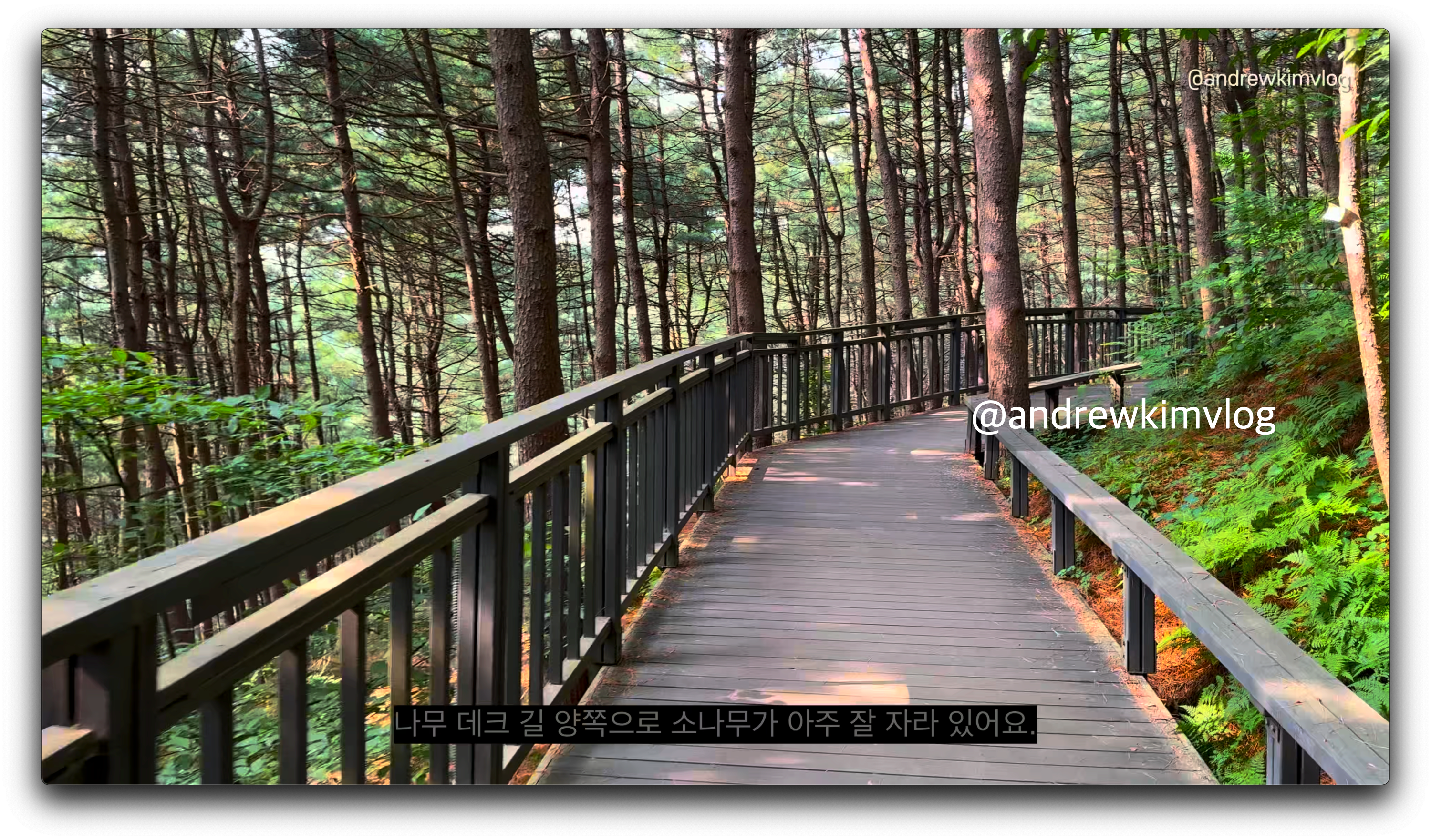 길 옆에 해충 기피제를 뿌리며, 나무 데크 길을 따라 걷습니다. 소나무가 잘 자란 길을 지나, 정자 쉼터와 약수터에서 물을 보충합니다.