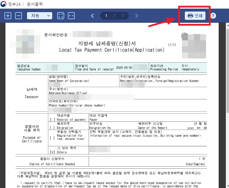 짜잔~ 그러면 다음과 같이 지방세 완납증명서(납세증명서)가 나옵니다~