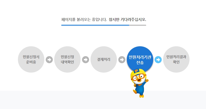 '민원신청하기'를 누르면 아래와 같이 '페이지를 불러오는 중입니다. 잠시만 기다려주십시오.'라고 나옵니다.