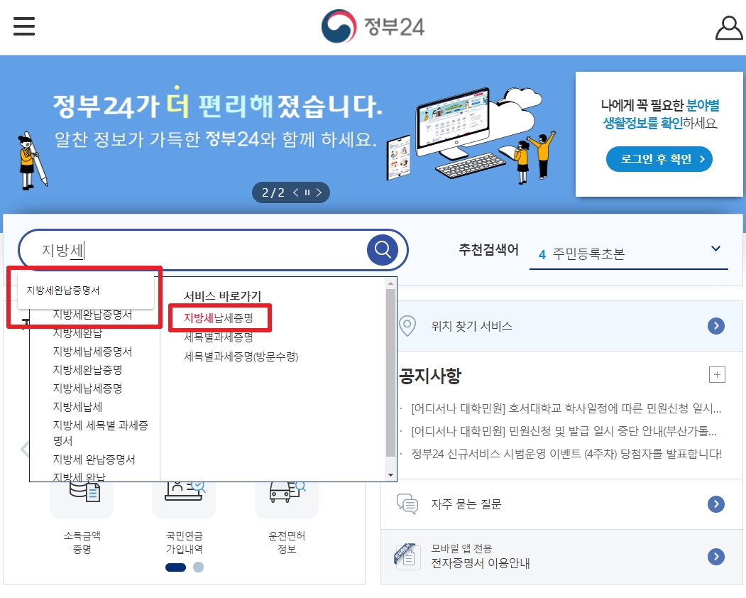 혹시나 아예 처음부터 '정부24' 홈페이지의 첫화면으로 들어가셨다면 정부24 검색창에 '지방세' 세 글자만 입력해도 자동완성 단어가 뜨는데 우리는 '지방세납세증명'을 클릭해주고 다음단계로 진행해줘도 됩니다^^